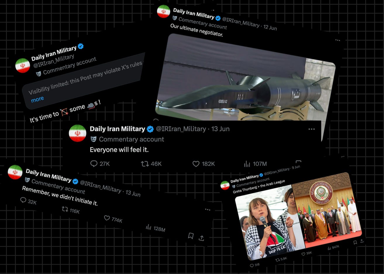 L’admin di @IRIran_Military – uno dei profili ufficiali delle forze armate iraniane – sta facendo gli straordinari per scrivere su X una versione contemporanea de Il buon soldato Sc'vèik. Immagino tu abbia già visto i tweet di questi giorni. Nel dubbio, eccone alcuni: