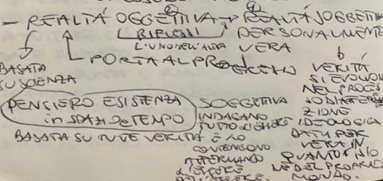 A diciott’anni creai il mio sistema filosofico e lo descrissi in una piccola Moleskine, la mia personale Critica della ragion pura. Al centro c’era un “Io” intorno a cui girava tutto e le implicazioni logiche conducevano a una sorta di solipsismo stoico che eliminava il problema dell’essere, di Dio e della verità.